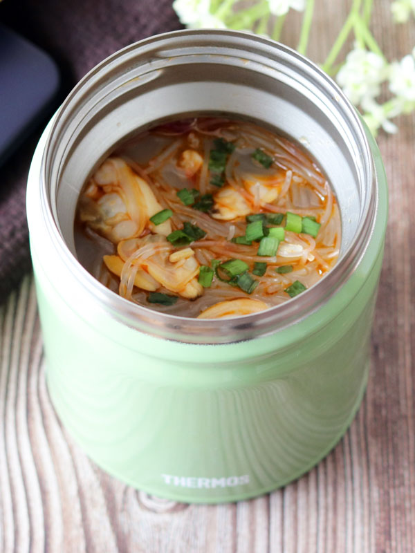 スープジャーの湯を捨て 2 を入れ、青ねぎ(小口切り)を散らし、30分保温する。