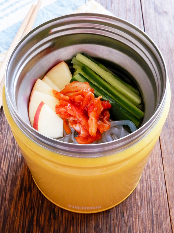 スープジャーの氷水を捨て、Aの材料を入れて混ぜ、水気を切った白滝を入れ、キムチ、りんご、きゅうりをのせる。