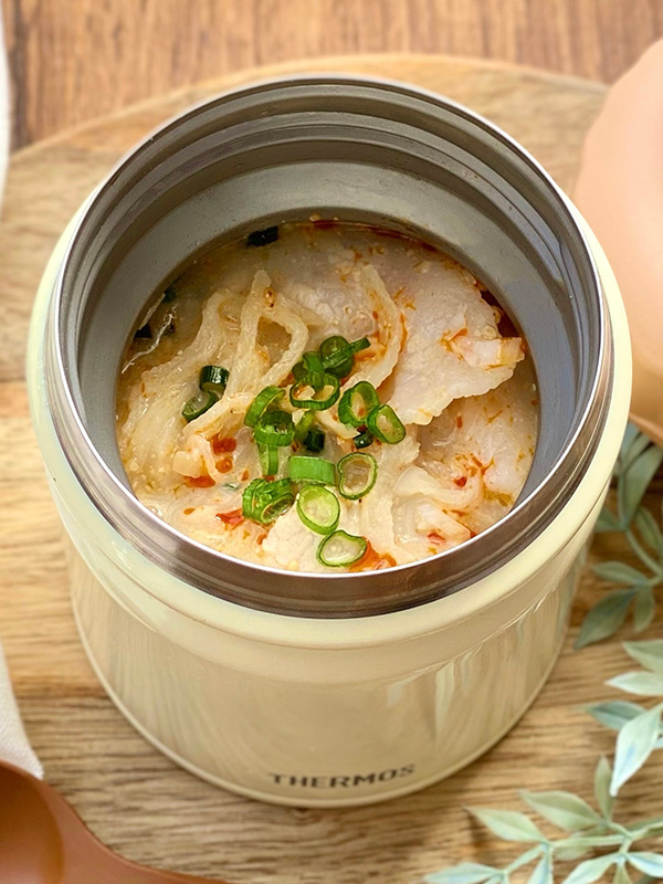 2を注ぎ、青ねぎ(小口切り)を散らし、ラー油(お好みで)をかけたら、フタをして30分以上保温する。