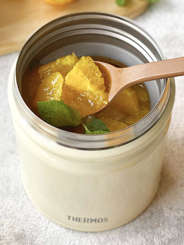スープジャーの氷水を捨てて水気をふき取り、2のゼリー液と3の果肉を入れて軽く混ぜる。フタをして3時間程保冷する。