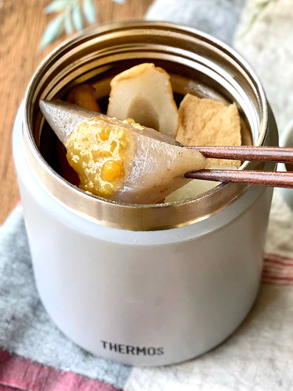 スープジャーのお湯を捨て、おでんを入れて3時間程保温する。お好みでみそダレをつけても!