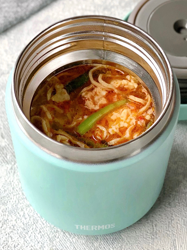 スープジャーのお湯を捨てる。豆腐干を1度取り出し、水気をよく切ってスープジャーに戻す。2を注ぎ、お好みでラー油・一味唐辛子をかけて辛さを調整する。