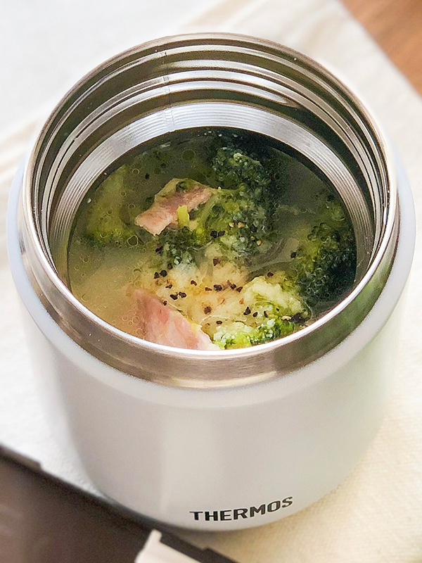 スープジャーに熱湯(分量外)を入れ、フタをせずに5分以上保温する。