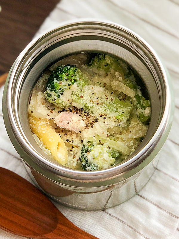 スープジャーの湯を捨て、ショートパスタ(ペンネ)を入れ、その上から3を入れる。お好みで粉チーズや黒こしょう(分量外)をかける。フタをして、3時間程度保温する。