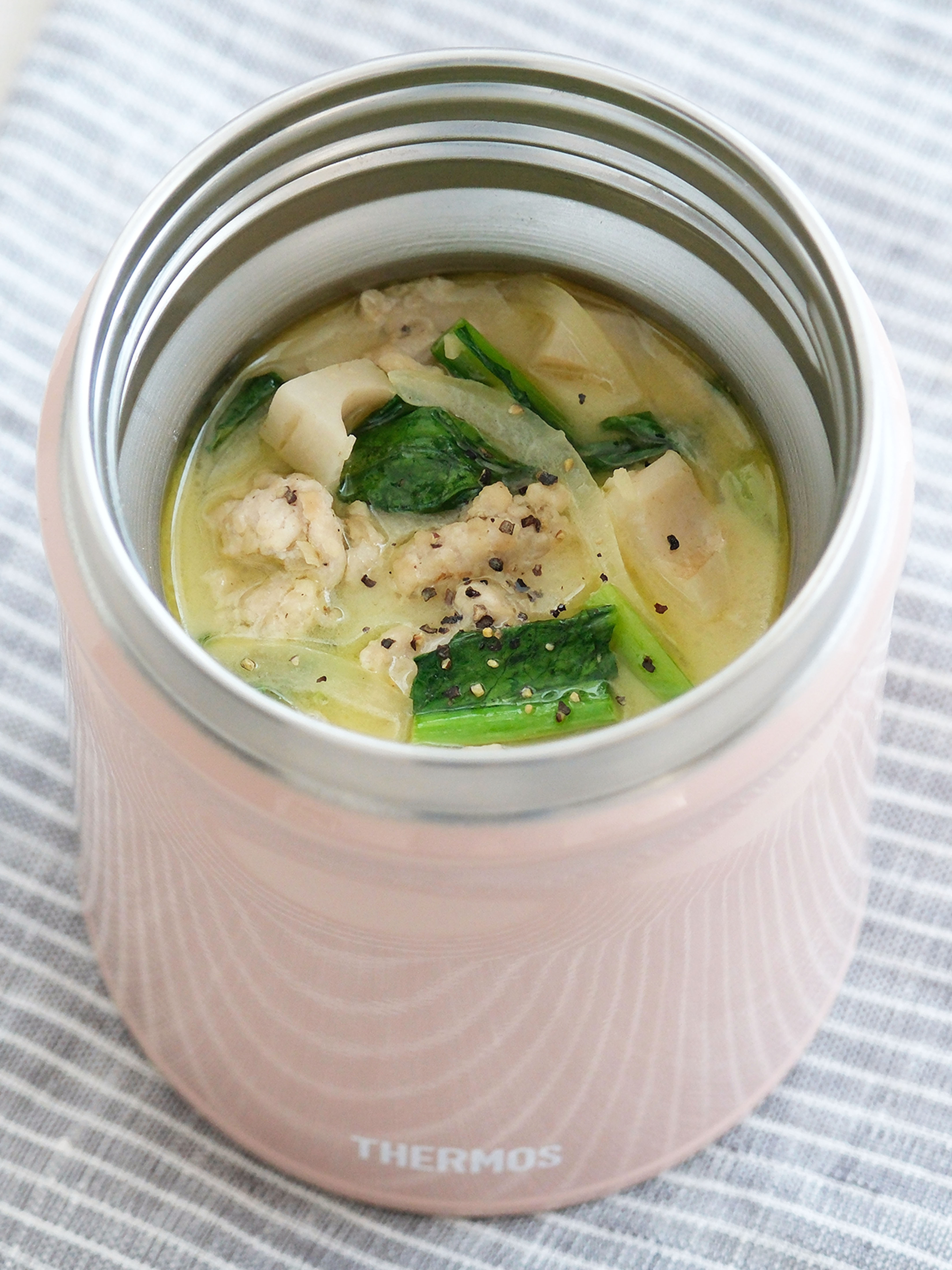 スープジャーの湯を捨て、4を入れる。粗びき黒こしょうをトッピングしてフタをし、30分以上保温する。