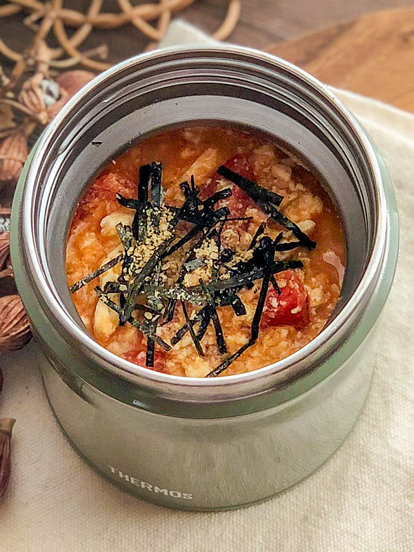 スープジャーの氷水を捨て水気をふき取り、トマト、絹ごし豆腐(手でちぎる)、ツナ缶(油漬け)、オートミール、Aを加えて混ぜる。