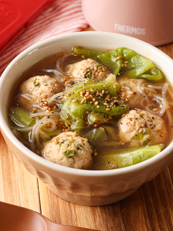 鶏肉団子のまわりが白くかたまってきたら、しらたき、ざく切りにしたキャベツを加え、全てに火が通るまでしばらく煮込む。火を止めいりごま(白)、ごま油を加える。