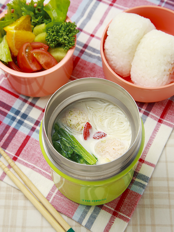 スープジャーに、小松菜、春雨、鶏団子を入れ、沸とうしたお湯を注ぎ、フタをせずに、3分ほど予熱する。