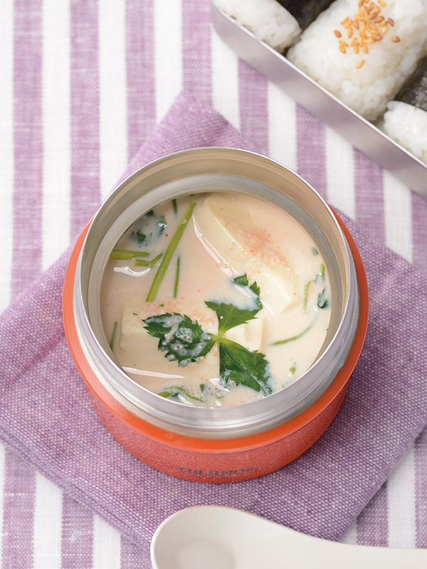 耐熱ボウルに豆乳と明太子・白だしを入れてよく混ぜ、豆腐を加え、ラップをして電子レンジ(600W)で2分加熱する。