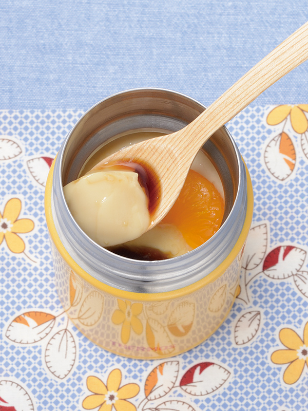 みかんの缶詰が入った豆乳と黒蜜のヘルシープリンです。スープジャーの保冷効果で3時間ほどで固まります。