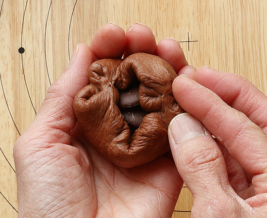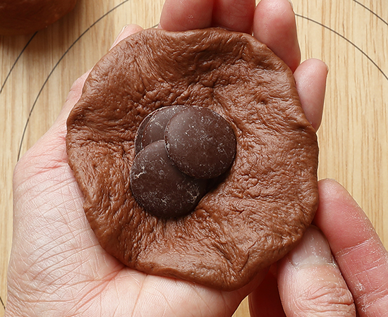 おやきあんぱん3~5の手順を参照し、麺棒で生地を10cm程度に伸ばしチョコレート10gを中心において包む。