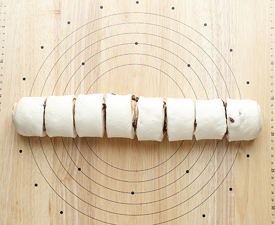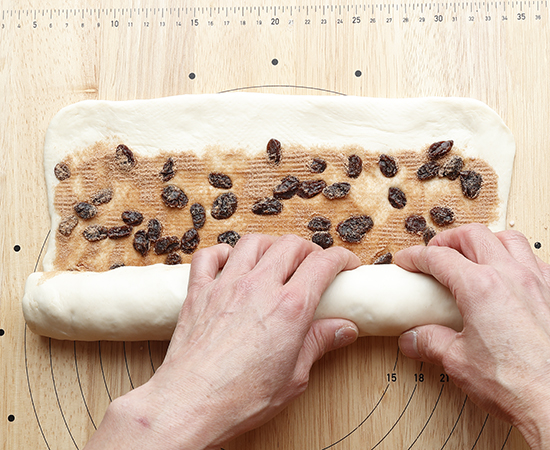 麺棒で生地を30cm四方に伸ばす。とじしろを奥2cmほど残してシナモンシュガーを振りかける。レーズンを散らし、生地に麺棒で押し付ける、手前からきつめにくるくると巻き、とじ目を指でしっかりつまんで閉じる。