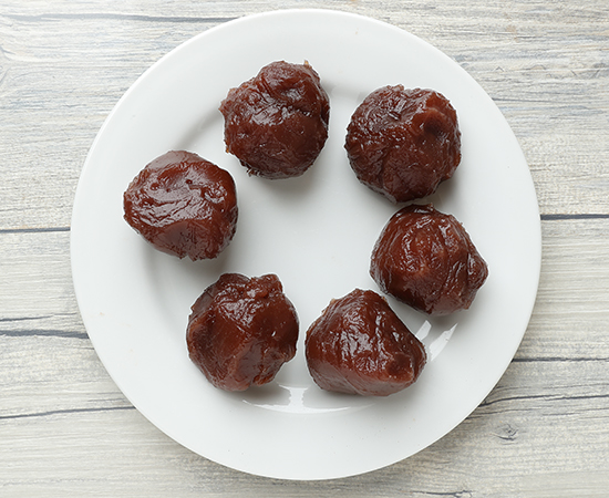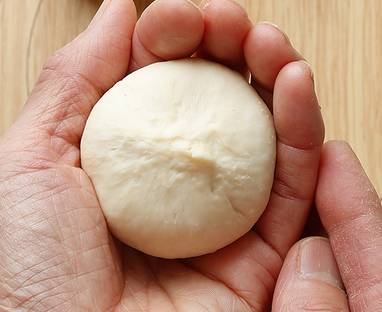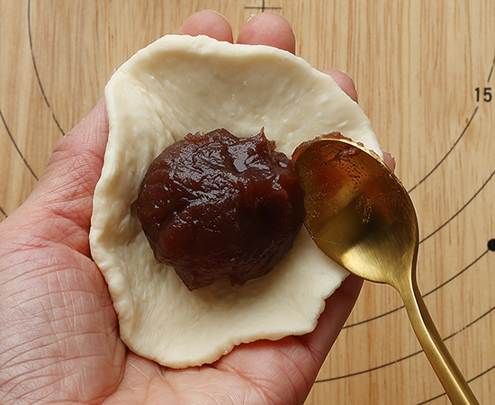 手のひらの上で生地を持ち、あんを押し込むようにして包む。とじ目をしっかり閉じる。