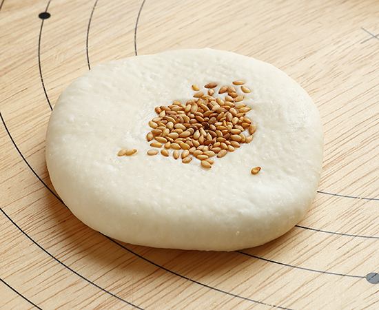 とじ目を下にして生地の中心に少量の水を使って白ごまをつけ、麺棒で平らにする。(目安:厚み1.5cm)