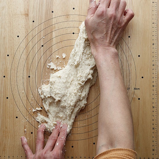 - 小麦粉の種類や気温・湿度により、生地がベタベタすることがあります。その場合は生地に加える水分を調整します。夏は湿度があるので、分量の水分を大さじ半分程度別にし、状態を見て少しずつ水分を加えます。逆に冬は湿度が低いので状態を見て水分を足します。