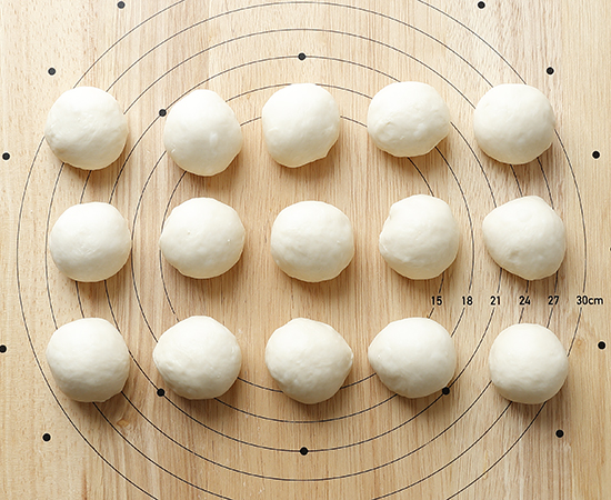 ふくらんだ生地をやさしく押さえてガス抜きし、15等分する。切り口が内側になるように軽く丸める。固く絞ったぬれ布巾をかぶせ、5分おく。