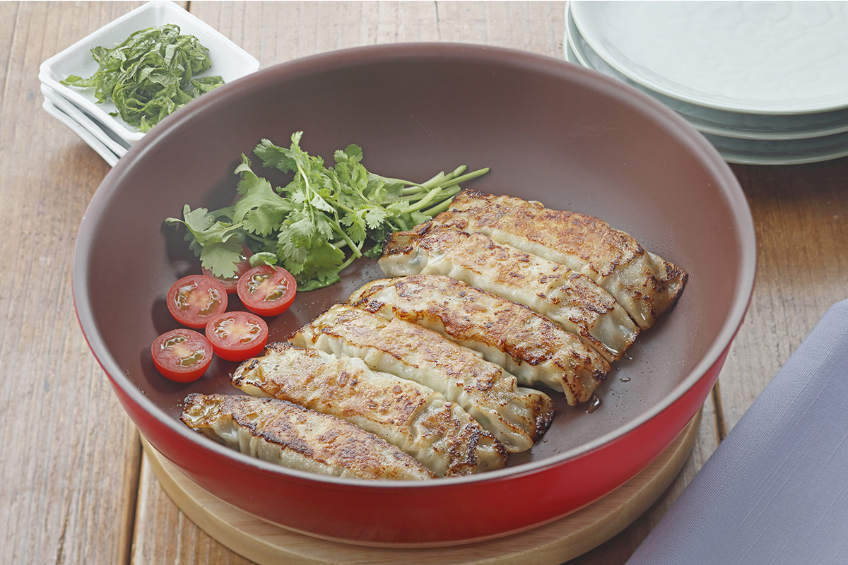 フライパンで焼いたらそのまま食卓へ。取っ手を外せば、まるで本場の熱々『棒餃子』。