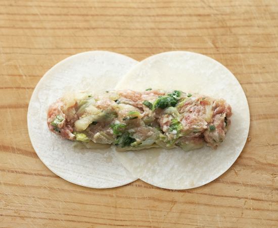 2枚の餃子の皮を横に並べて、1/3ほど重ね、重ねた部分に水を塗りつなげる。具の1/12の量を皮の中央に棒状になるように左右に広げてのせる。