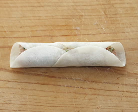 皮の手前と奥を具材の中央で合わせ、水をつけて留めて包む。