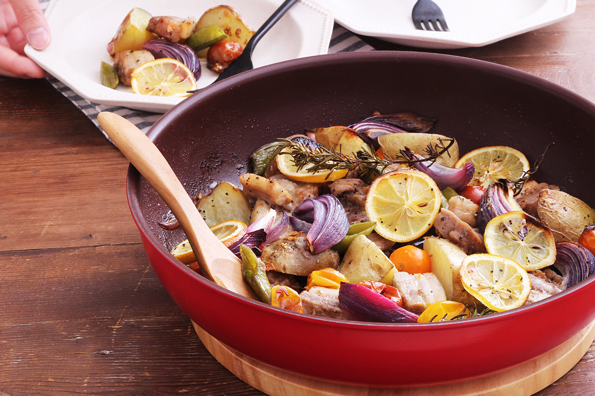 アーリーレッドとレモンも加え出来上がりを想定して具材を並べ、残りのオリーブオイル(大さじ1)と塩、粗挽き黒こしょうを全体にふりかける。