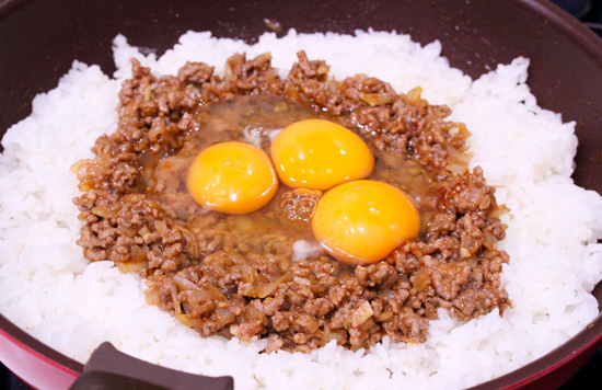 フライパンの周りにご飯を入れ中央に 3 を戻し入れ、少しくぼみを作り卵を割り入れフタをして5分ほど弱めの中火で加熱し火を通す。
