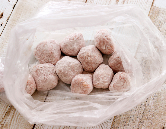 大きめのポリ袋に片栗粉を入れ、そこへ 1 を一口大に丸めて入れ、袋に空気を入れるようにし、よく振り、片栗粉をまんべんなくかぶす。