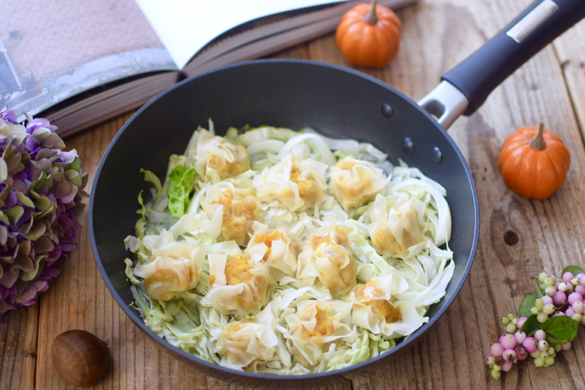 キャベツを敷き詰めたフライパンの上にシュウマイをのせる。ぎっちりと敷き詰めずに適度に隙間を開けるように並べる。