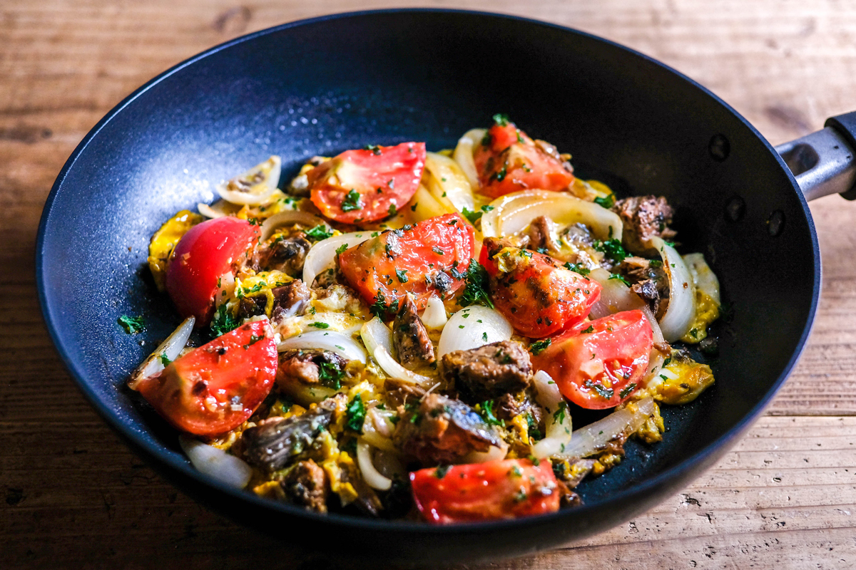 忙しい日にぴったりのサバ缶を使った栄養満点の洋風卵とじです。材料を用意すれば、あとは順番にフライパンに入れて炒め合わせていくだけ。お酒のおつまみにもおすすめです。