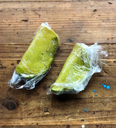 ラップの上に2の生地をのせ、半分にふんわり折りたたんで冷ます。
