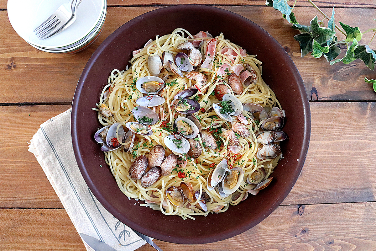 あさりを手の中で優しくこすり合わせて洗い、バットに並べる。あさりが半分浸かるくらいの塩水(海水と同じくらいの塩気)をそそぎ、キッチンペーパーをかぶせて冷蔵庫で2時間ほど置く。使う前に軽く洗い流す。ベーコンは1cm幅に切る。にんにくはみじん切りにする。