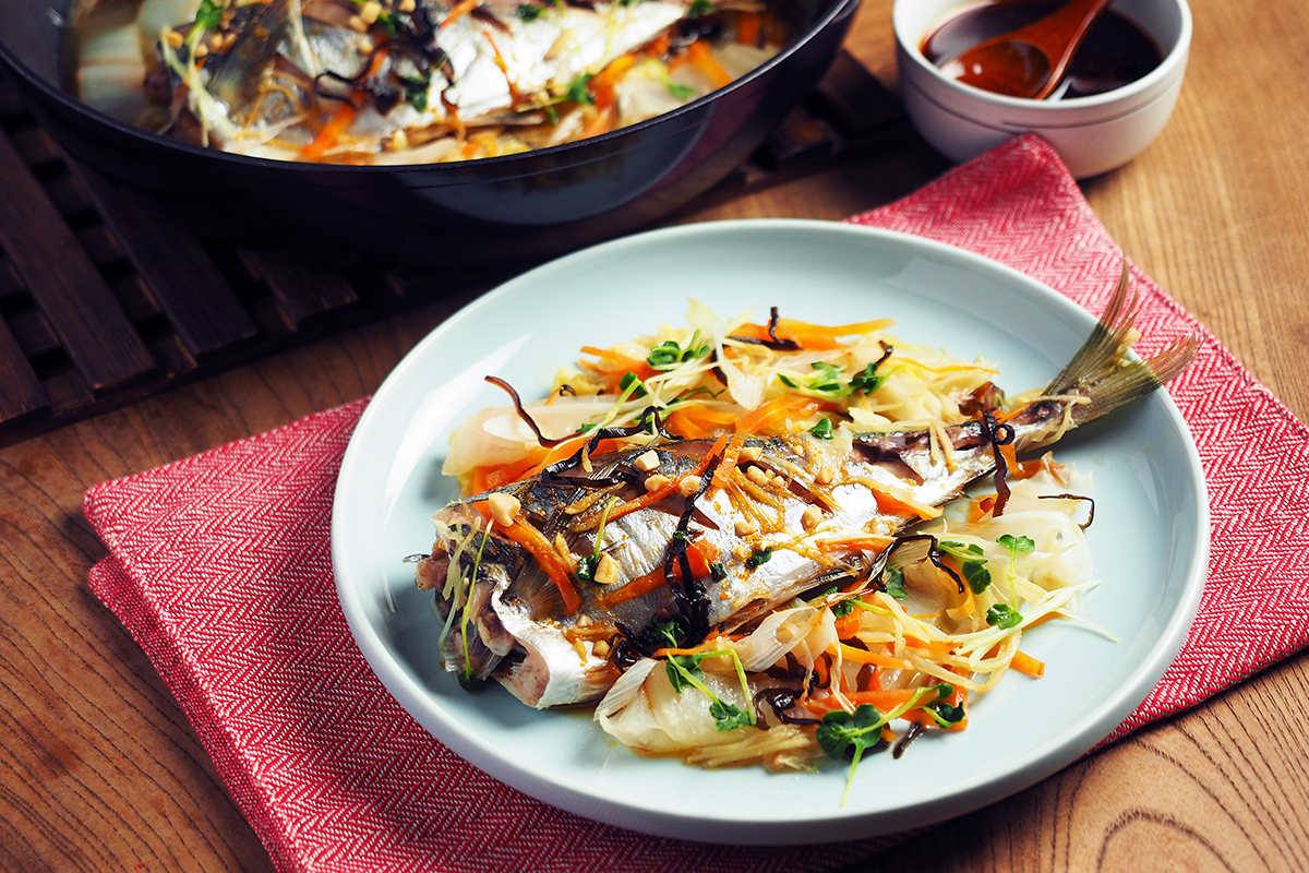 いったんフタを外し、貝割れ菜をちらす。再度フタをして1分蒸らす。フライパンのまま食卓に運び、あじを野菜ごとすくって皿に盛る。砕いたピーナッツをちらし、お好みでよだれ鶏風激辛ソースをかけて頂く。