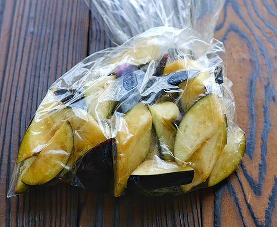 蒸し焼きにしている間に、なすを縦半分に切ってから乱切りにする。ポリ袋に入れ、ごま油を加えて全体になじませる。