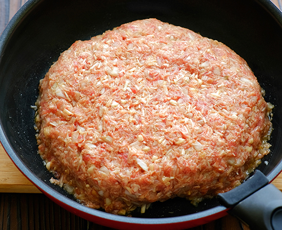フライパンに油を薄くひき、1 をのせ、形を丸く整えたら火をつける。ジューっと音がしてきたらフタをして中火で4分焼く。