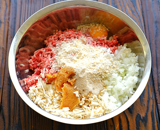 ボウルに合いびき肉、玉ねぎ、えのきだけと A を入れ、よく練り混ぜる。