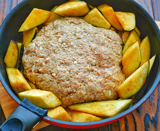 3 のハンバーグの周りに 4 のなすをなるべく皮を下にして並べ入れる。C を回し入れ、生しいたけをのせる。フタをして弱めの中火で煮る。