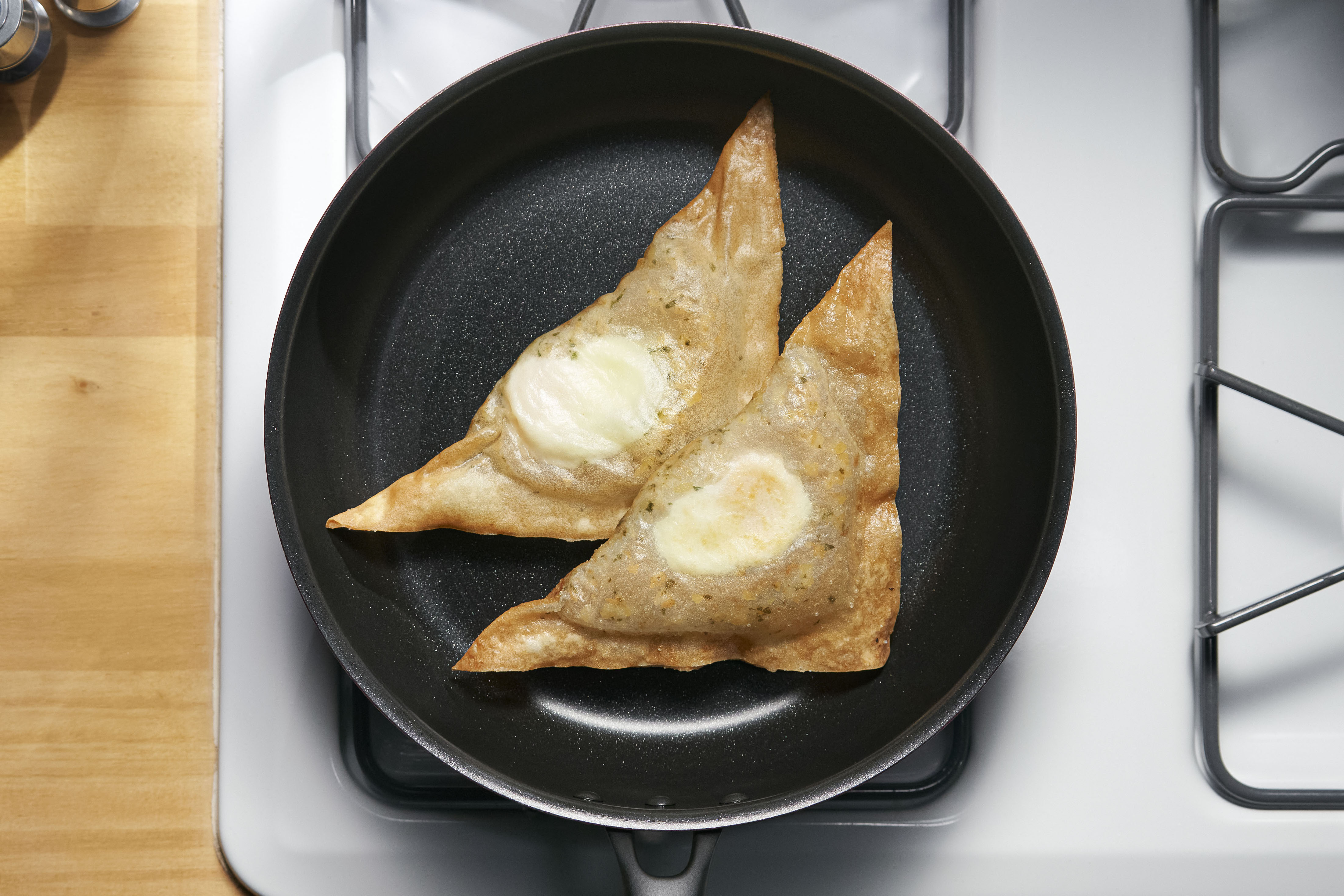 春巻きの皮に2の1/4量、温泉卵をのせ、三角形になるように皮を半分に折りたたむ。
