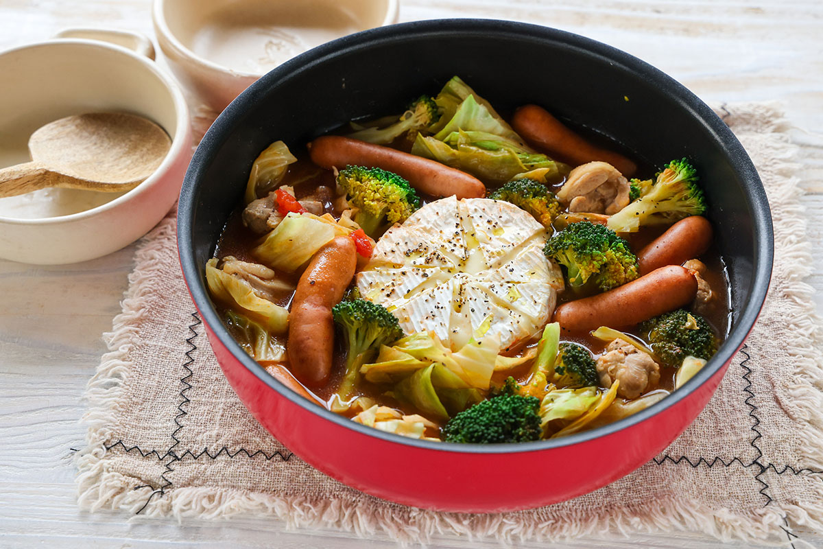 鶏肉はひと口大に切る。キャベツはざく切りにする。ブロッコリーは小房に分ける。カマンベールチーズは8等分に切れ目を入れる。