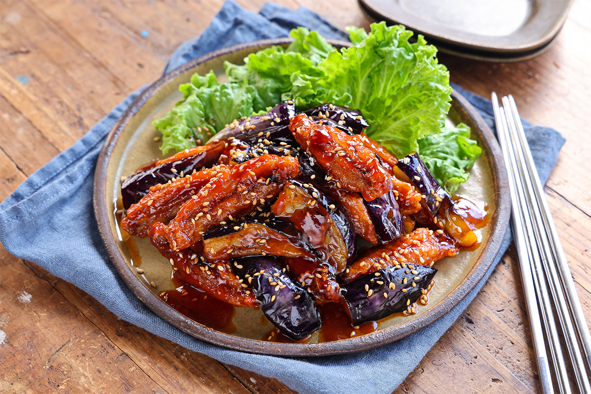 手羽中となすを揚げ焼きにして甘辛いヤンニョムだれで仕上げました。