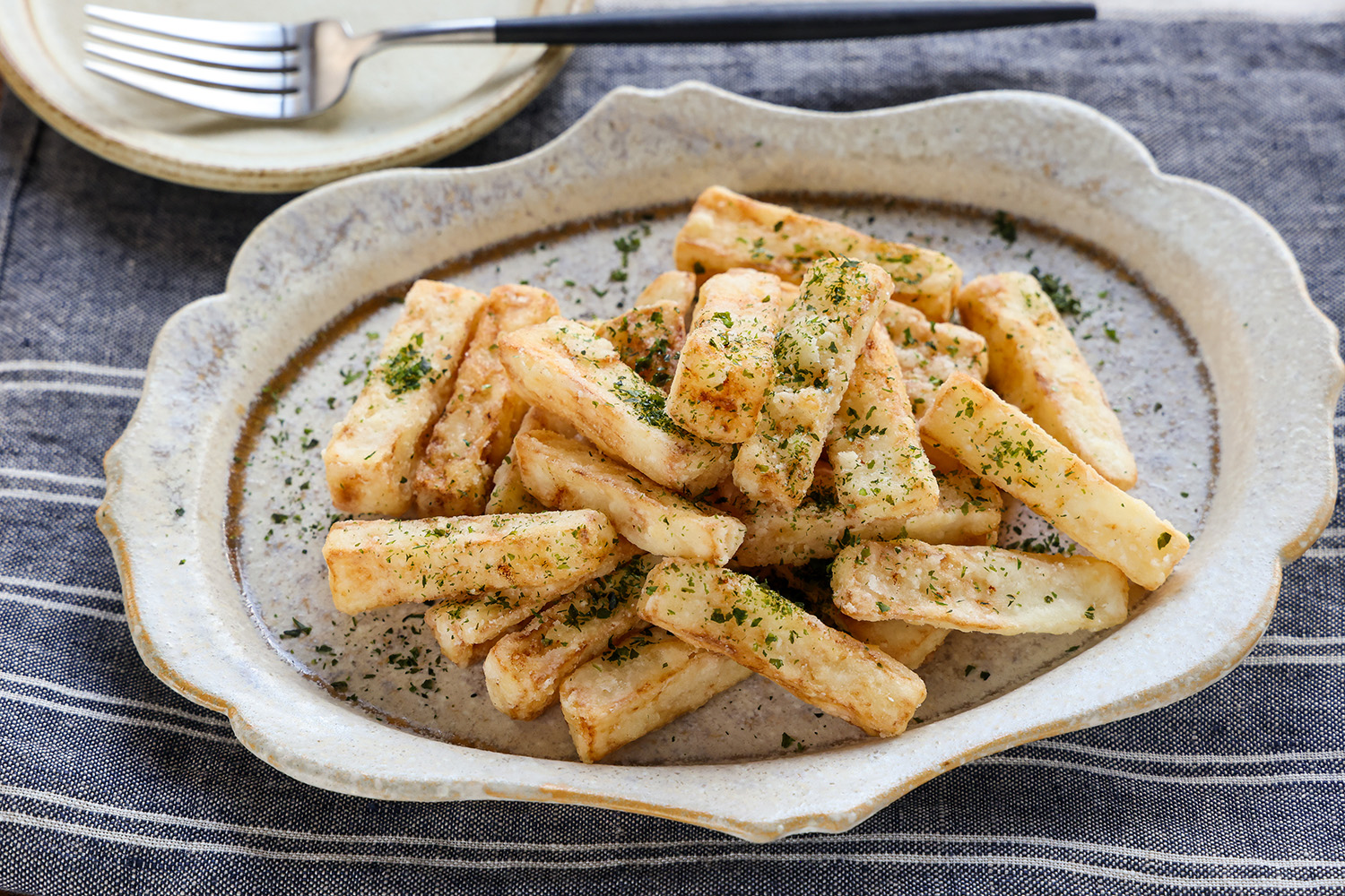 長芋は皮をむき、5cm長さ、1cm角くらいの棒状に切り、片栗粉をしっかりまぶす。