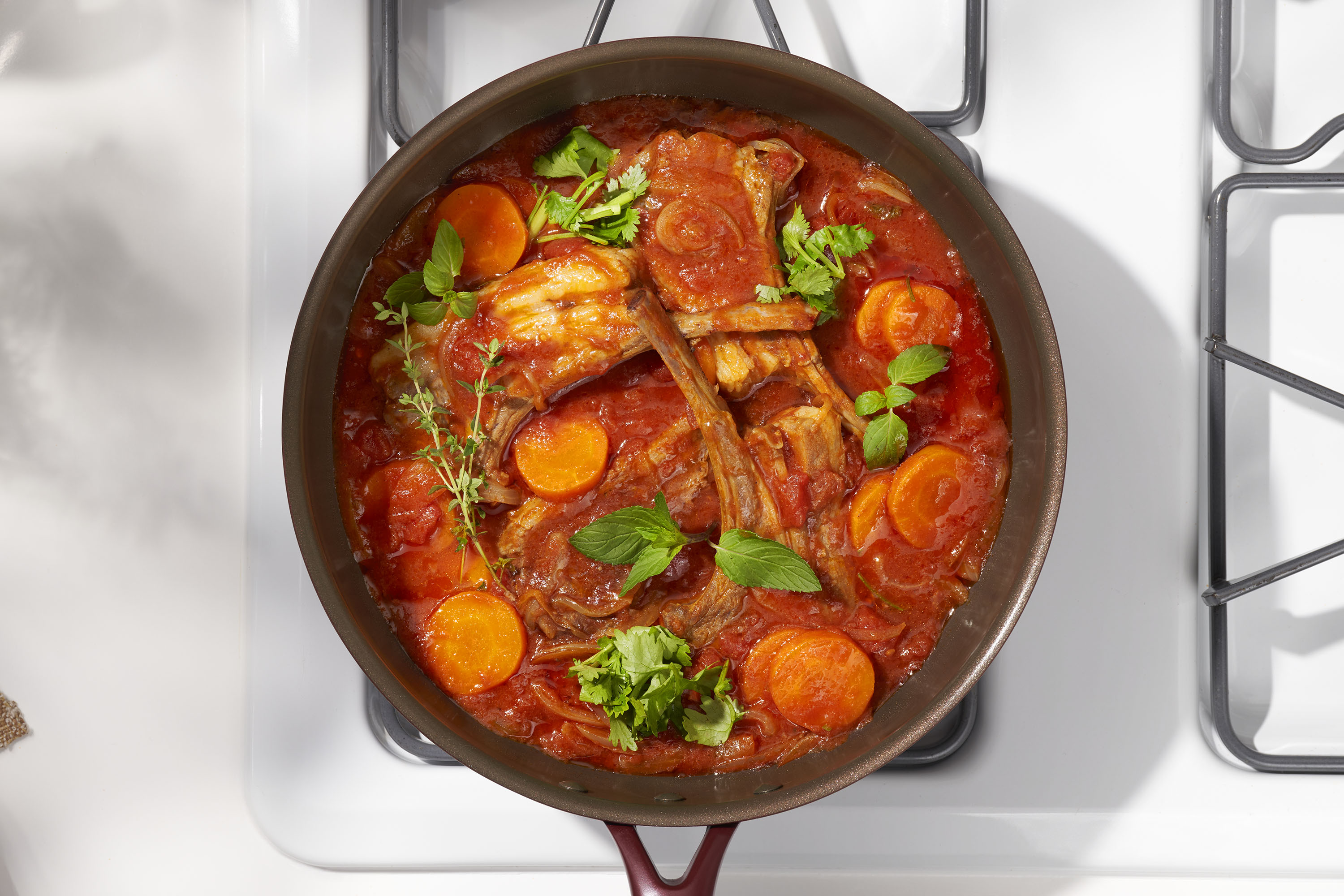 フライパンにオリーブオイルを熱し、玉ねぎとにんにくをしんなりするまで炒め、端に寄せる。ラムチョップを焦げ目がつくまで両面焼き、にんじん、トマト缶、塩、カレー粉、水1カップを加え、弱めの中火で15分ほど煮る。
