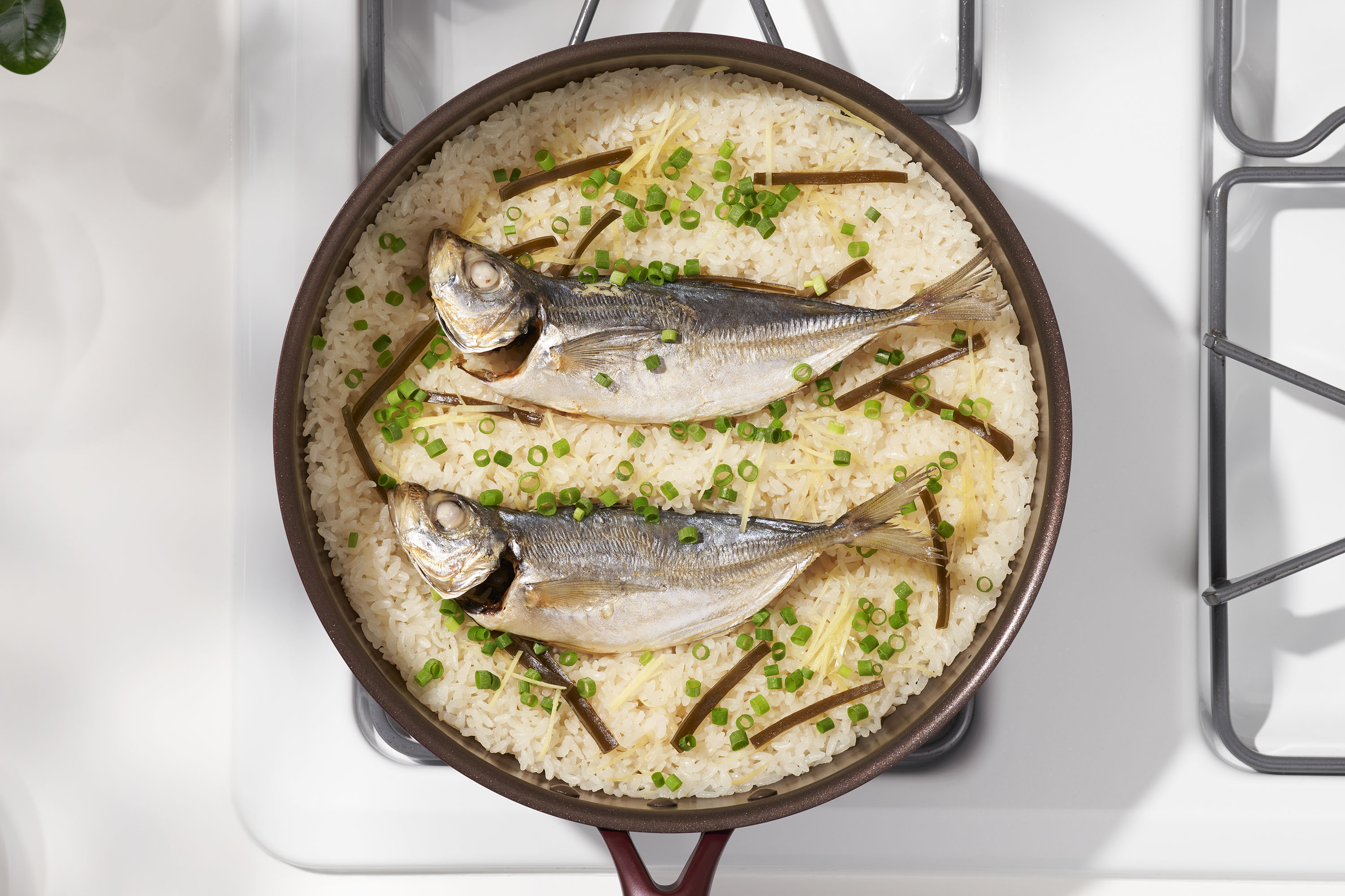 フタをして中火にかけ、沸とうしてきたら弱火で15分炊く。その後、30秒強火にして火を止める。小口切りにした細ネギを散らし、フタをして3分蒸らす。