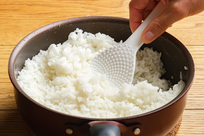 フタを取り、ご飯を混ぜ、中にこもった水分を飛ばす。