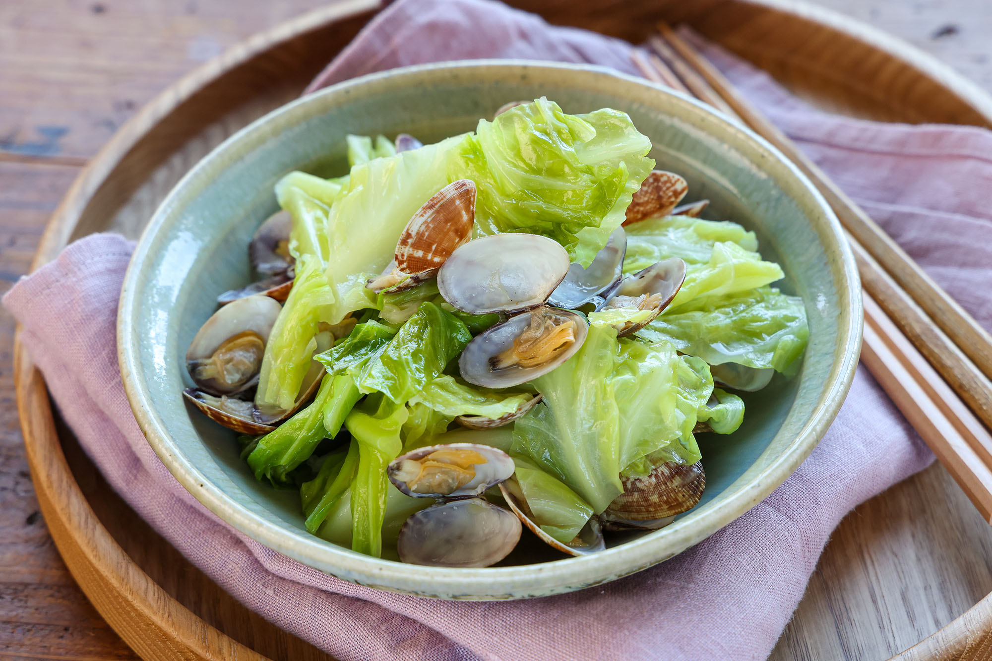 炒め鍋(深いフライパン)にあさり、キャベツの順番に重ね入れ、Aを加える。