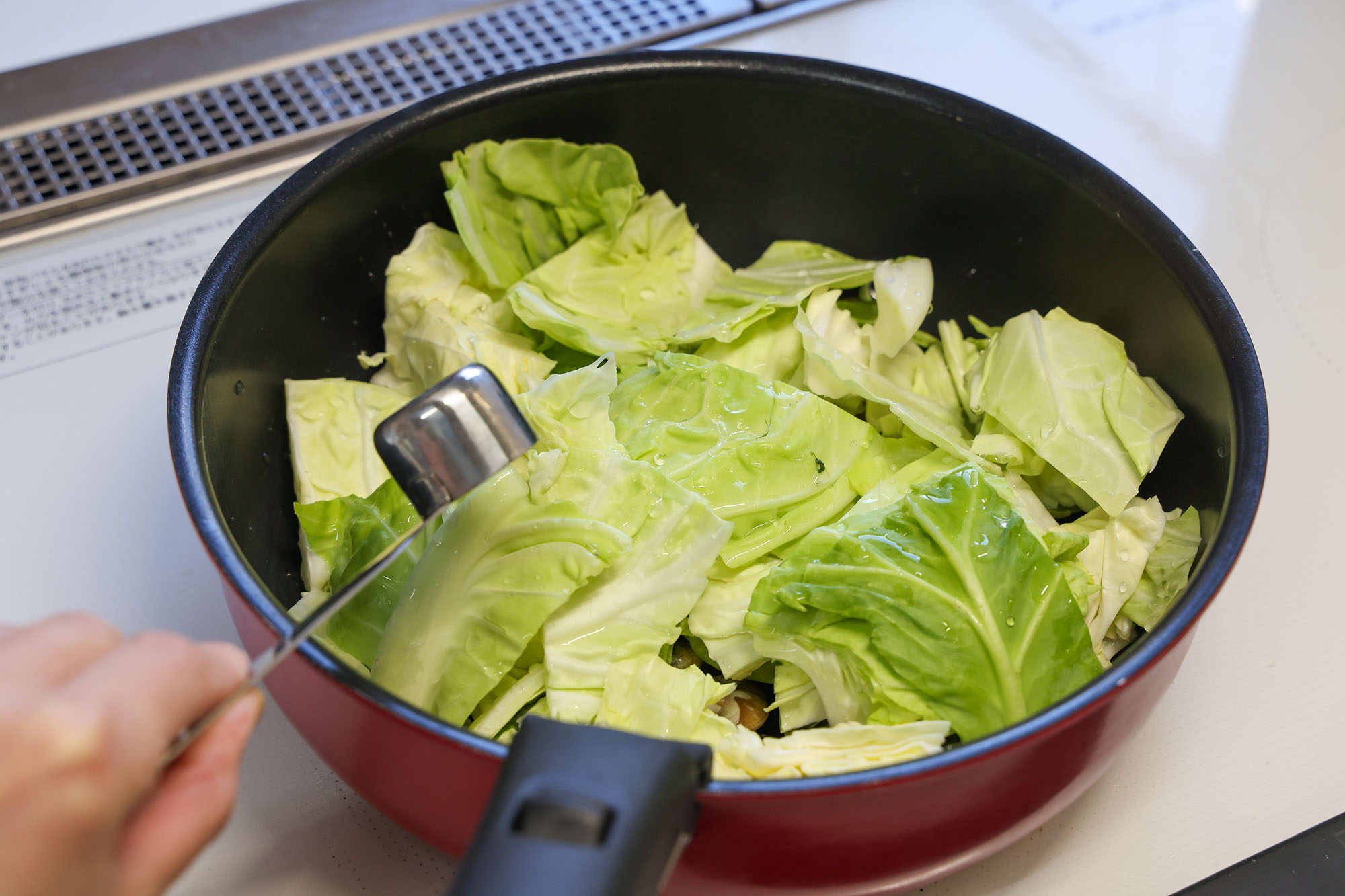 フタをし、中火にかけ、10分程蒸し焼きにする。