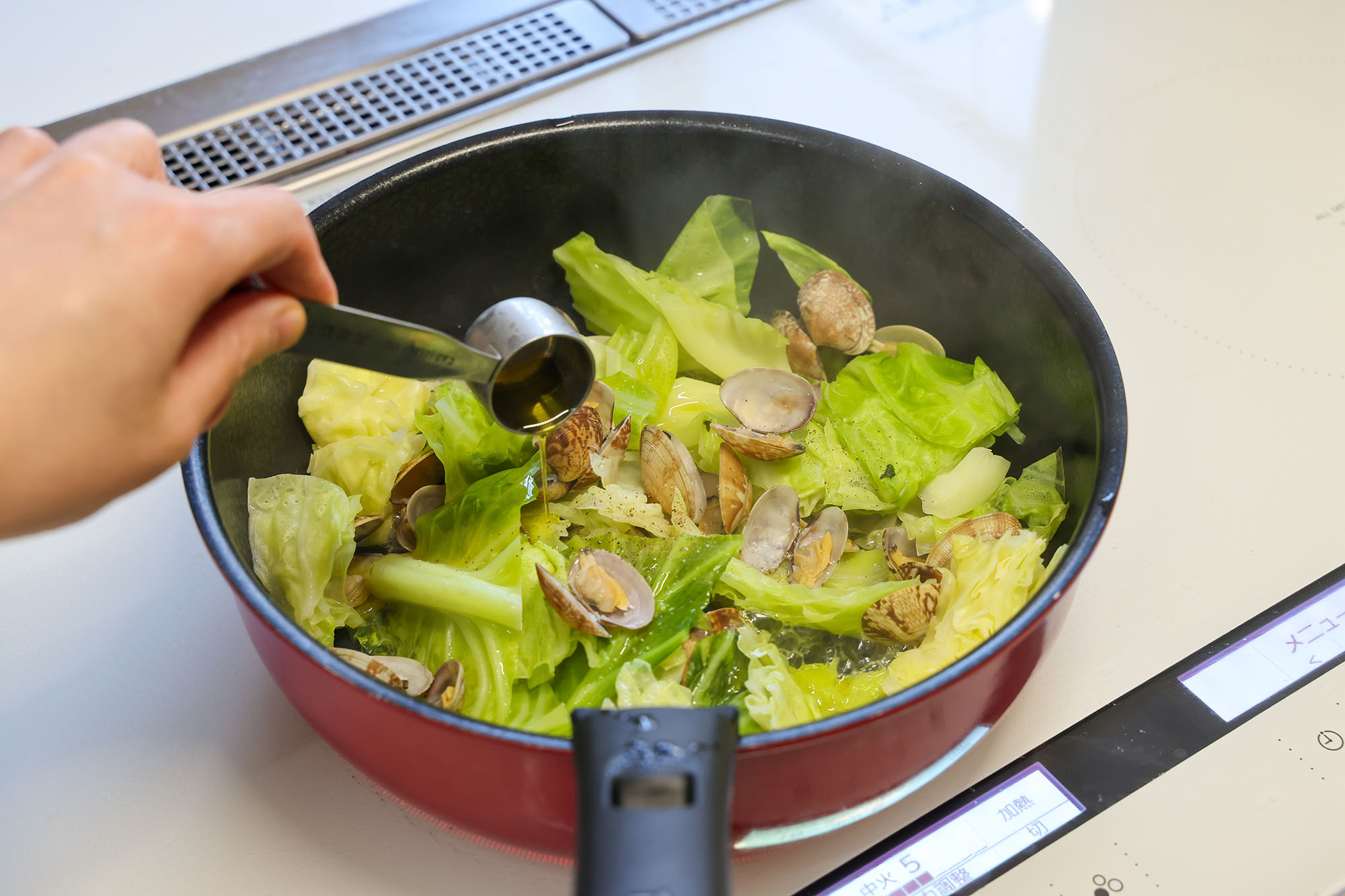 あさりの口が開いたら塩、こしょうで味を調え、オリーブ油をまわしかける。