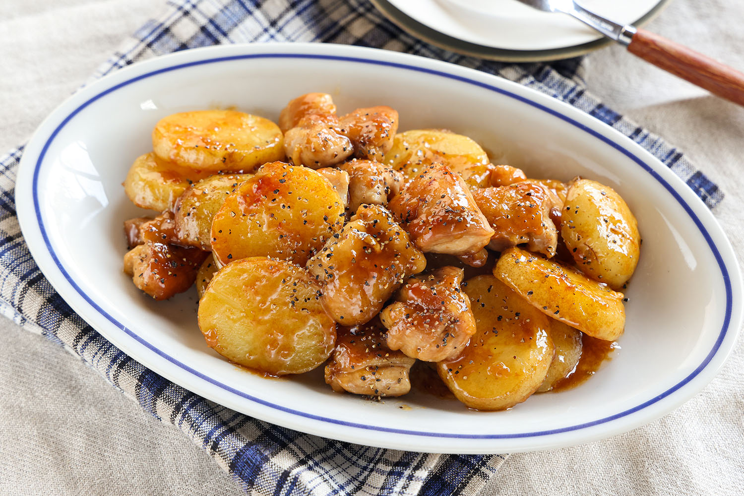 鶏肉は3cm大に切り、塩・こしょうを振って薄力粉をまぶす。じゃがいもは皮ごと1cm幅の輪切りにする。