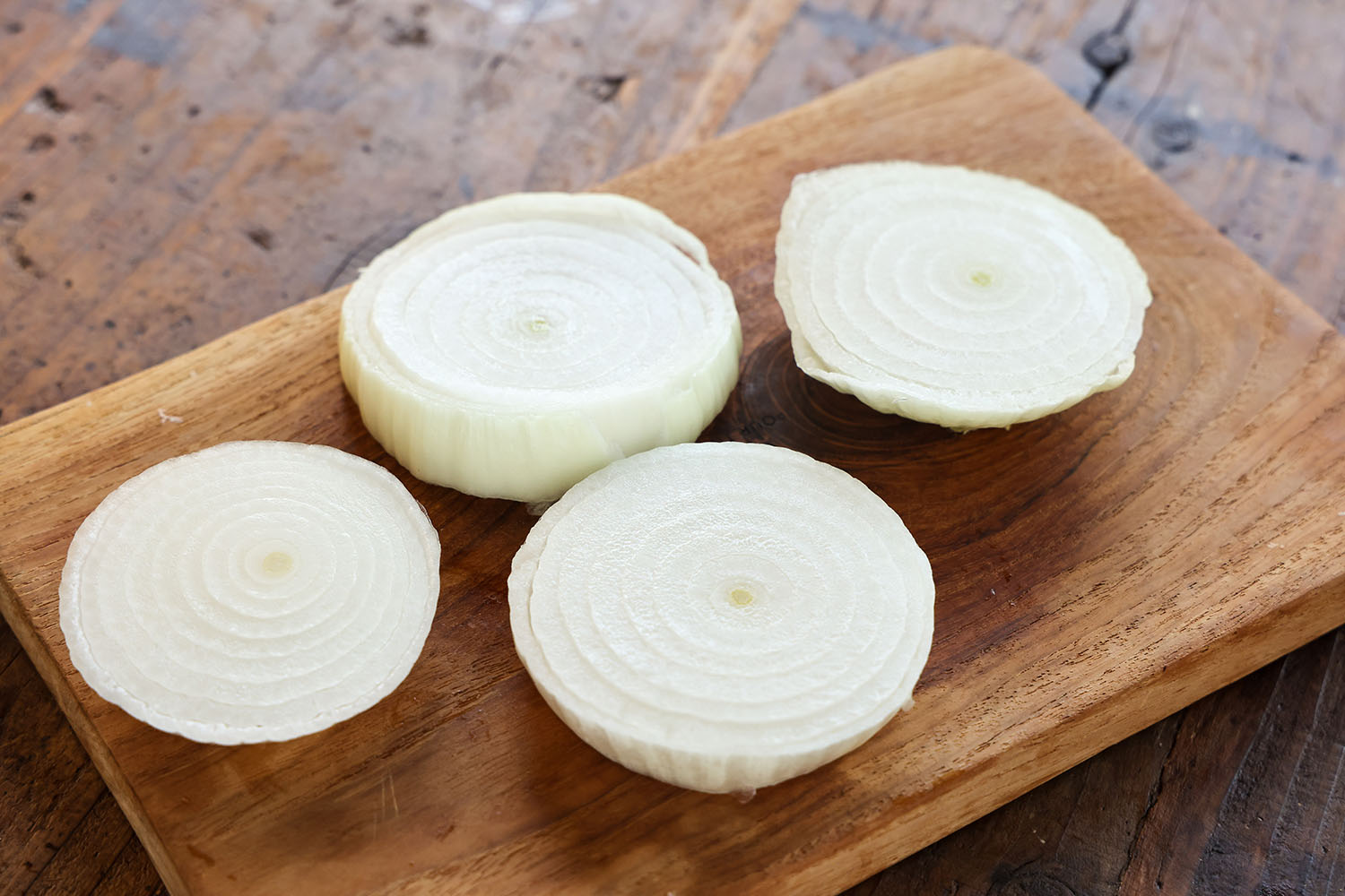 新玉ねぎは上下を切り落とし、横4等分に切る。