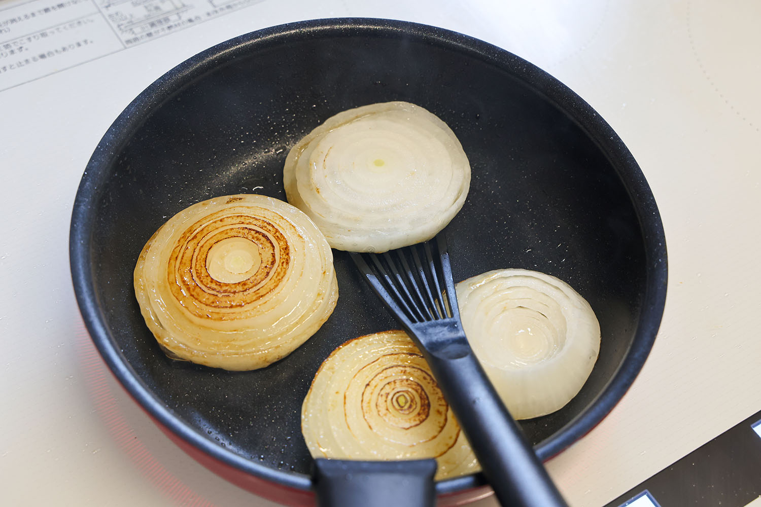 ・新玉ねぎがバラバラにならないよう、ヘラを使って裏返します。