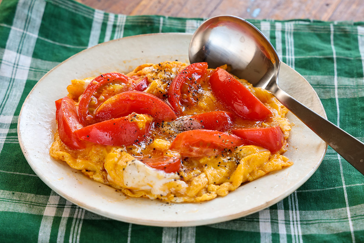フライパンにサラダ油を強めの中火で熱し、トマトを両面焼く。トマトが温まったら強火にし、卵液を流し入れる。