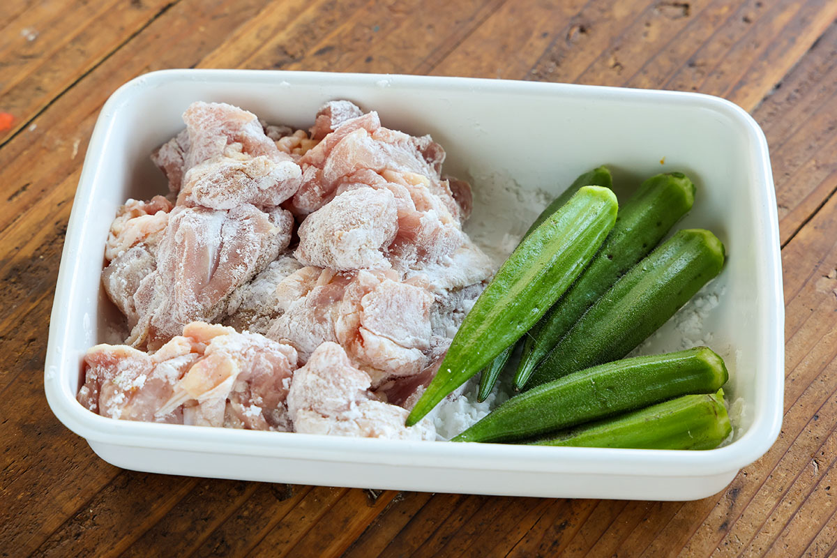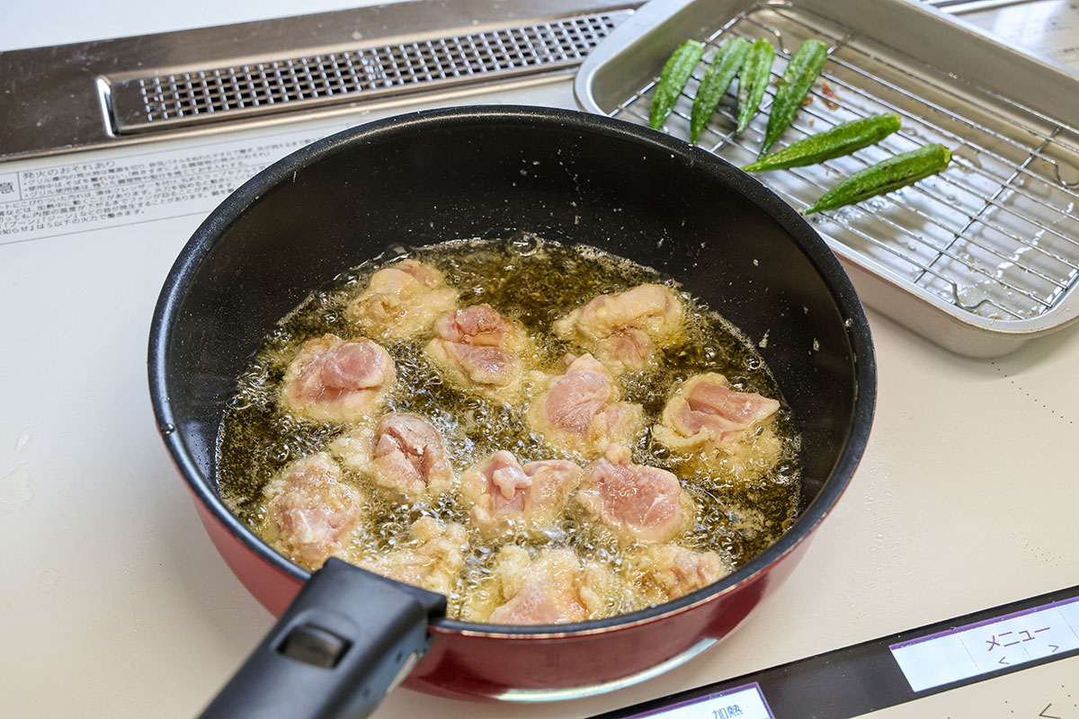 炒め鍋に5mmの深さの油を中火で熱し、オクラ、鶏肉の順で揚げ焼きにする。